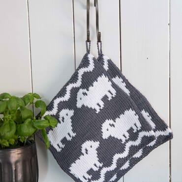 Grydelapper med får ( 1421-25) – strikket i bomuld 8/4. Bomuld 8/4 er den mest velegnede bomuldskvalitet til strik eller hækl til blandt andet karklude og er nok den mest anvendte garnkvalitet i Danmark.